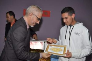 ثم وُزعت الجوائز الرمزية والشواهد التقديرية على التلاميذ الأوائل في كل مسلك، قدمها ضيوف الحفل وآباء التلاميذ وبعض الأطر الإدارية والتربوية بثانوية ابن الهيثم التأهيلية بالقنيطرة حيث قدّم فضيلة الأستاذ مدير المؤسسة السي سعيد القدوري والشاعر الكبير جهاد أبو محفوظ جائزة المرتبة الأولى في مسلك باكالوريا العلوم الإنسانية للمتفوقة التلميذة ملاك أمين وأعقبها تلاميذ آخرون.
